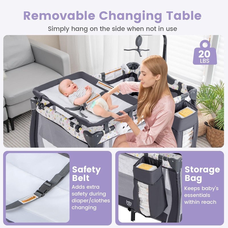 - 【Foldable Playard & Easy to Carry】 Featuring a push button, without any tools, this premium pack and play is easy to fold into a compact size which allows us to use and store it in the cabinet or against the wall with ease. Additionally, equipped with a handbag helps you store the folded crib and provides a place for your baby to sleep when you go out to visit relatives or travel. It's the best choice for going out to play!