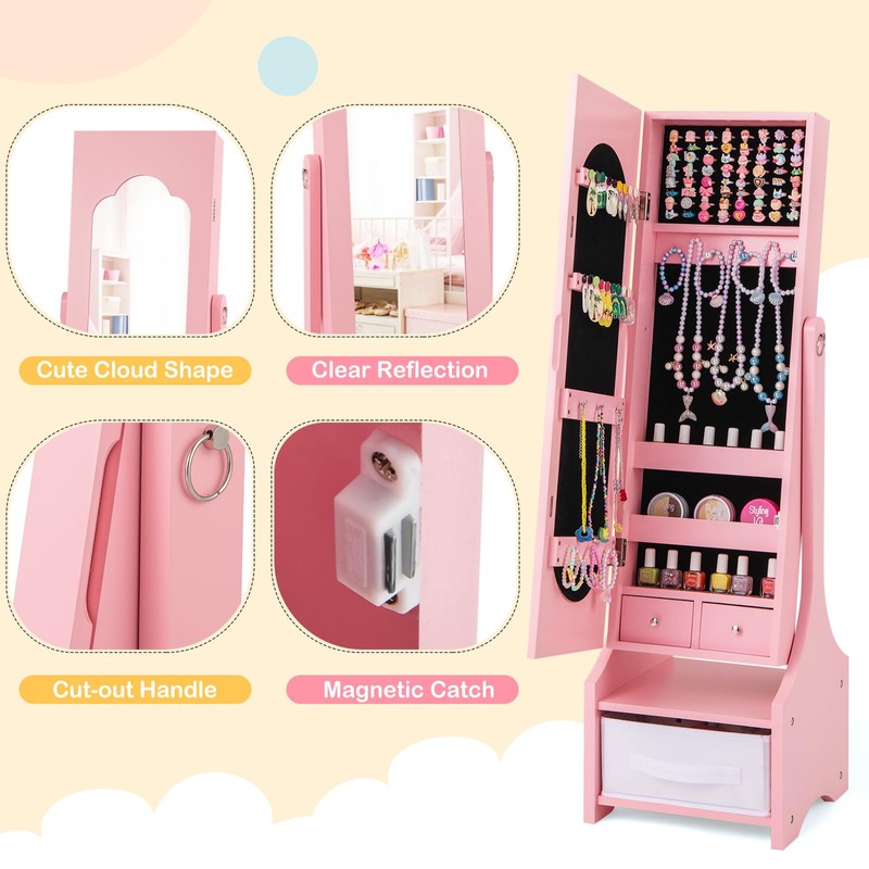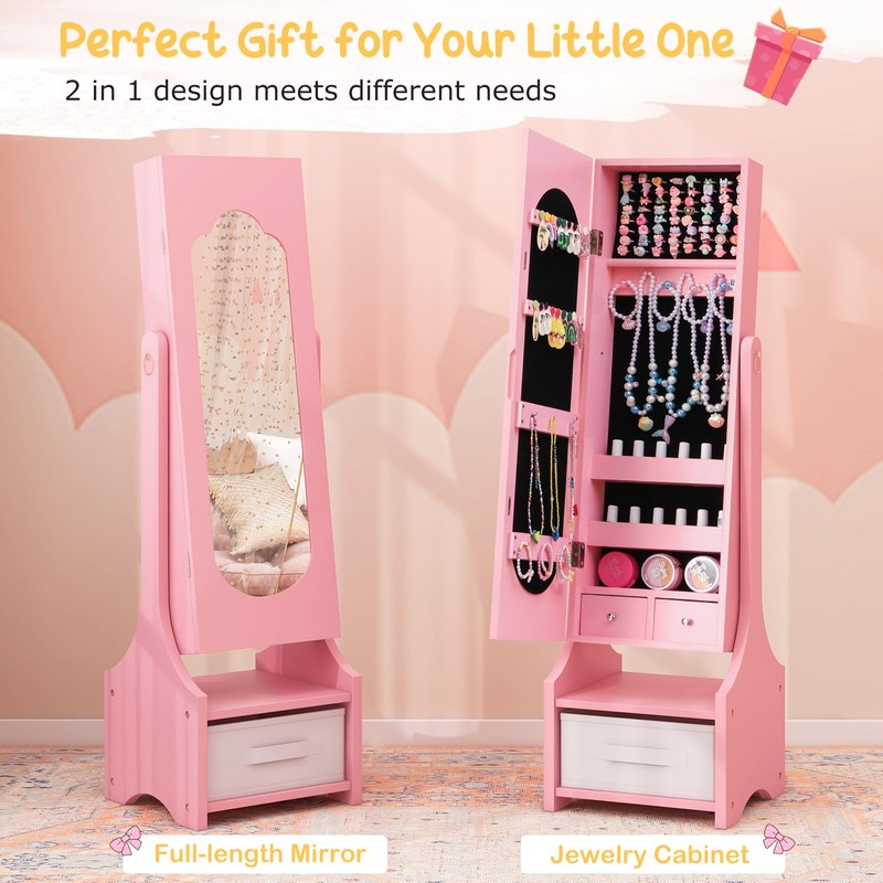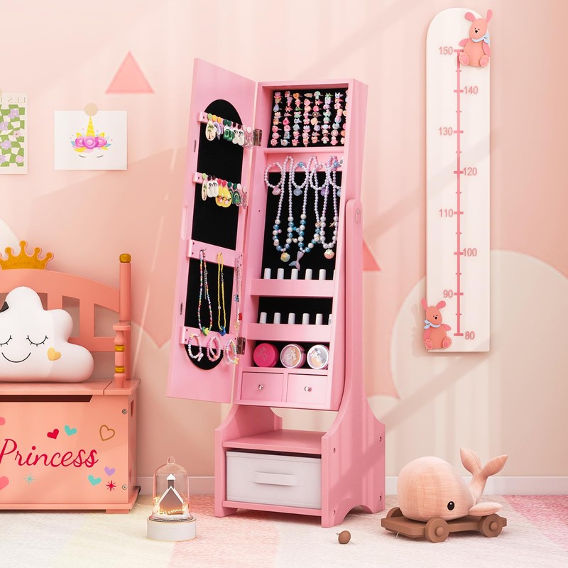 - Perfect Gift for Kids: Every little girl has a tiny dream of being a shiny princess. This standing jewelry armoire with full-length mirror allows your little one to dress up beautifully every day. With stylish design, it will be an excellent addition to the children's room and deeply loved by kids. Whether on birthday or Christmas, it’s absolutely a great gift! Suitable age: 3+ years old.