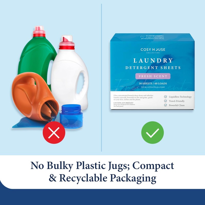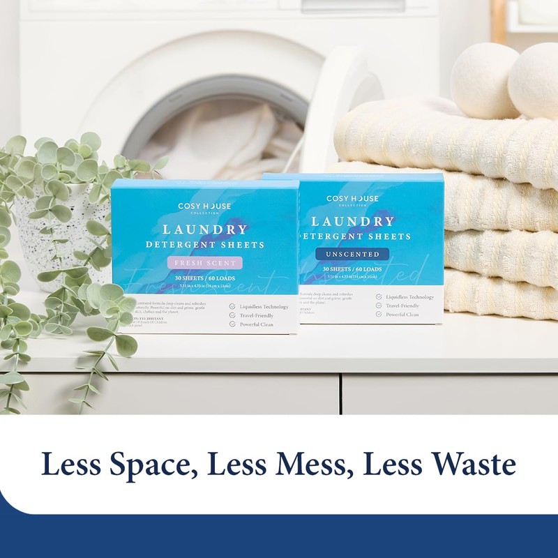 - LAUNDRY MADE EASY - Upgrade your laundry routine with mess-free Laundry Sheets! Our super-light, mindful laundry detergent sheets dissolve completely for a powerful clean that's gentle on clothes. No more bulky soap jugs, pods, or spills - just toss a sheet in and let Cosy handle the cleaning magic!