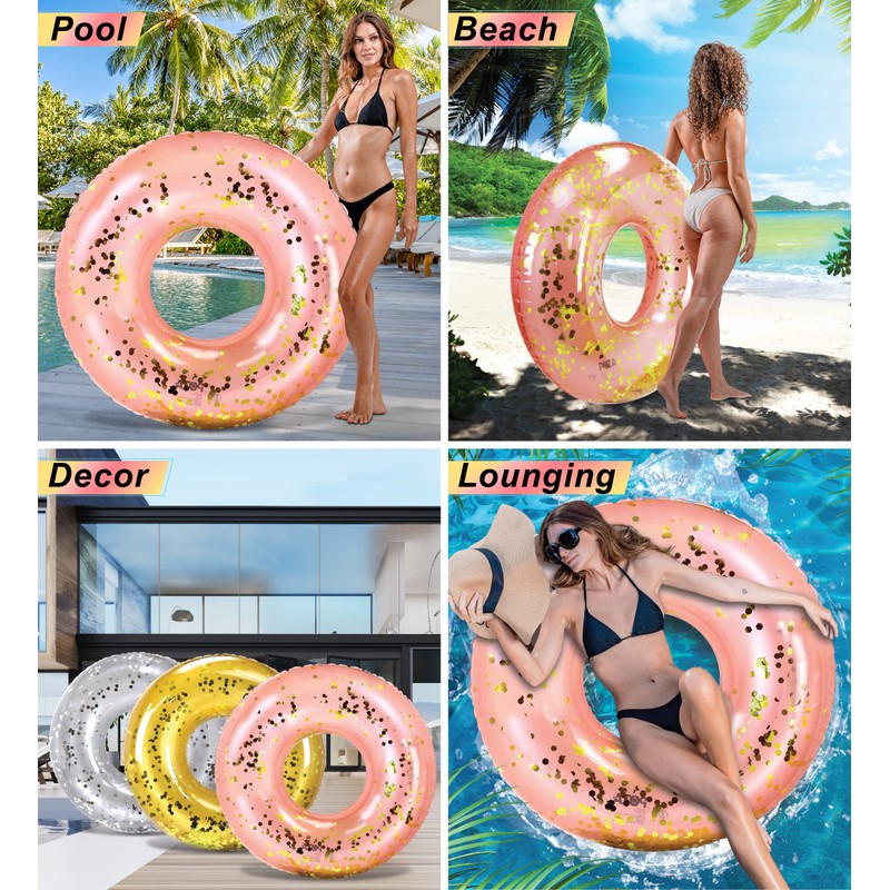 - THE ROSE GOLD INFLATABLE RING FLOAT COMES WITH UNIQUE DESIGN YOU WILL LOVE - Inflatable Giant Rose Gold Pool Tube floats filled with gold confetti will make a BIG splash for summer-filled fun. The glitter pool float desing makes the lounger a great summer accessory for your next beach or pool party. Whether you are relaxing or looking for a tan, lay on the Rose Gold glitter pool tube and chill in the water as you soak up the summer fun.
