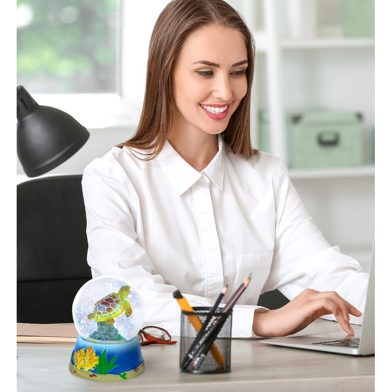 - THE TURTLE SNOW GLOBE COMES WITH A UNIQUE DESIGN YOU LOVE – Show your love for cute turtles with a sparkly fun Sea Turtle tabletop decor. The ocean animal snow globe figurine is shaped in ocean floor design with coral and seaweed and a sea turtle inside the water globe. Shake the globe to see the colorful sparkly snow confetti fall on top the turtle and enjoy the show! Our hand painted Turtle Globe is a unique novelty collectible home decor.