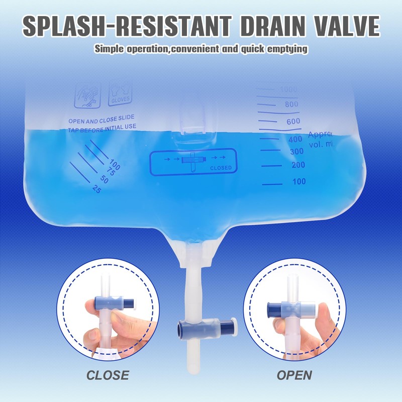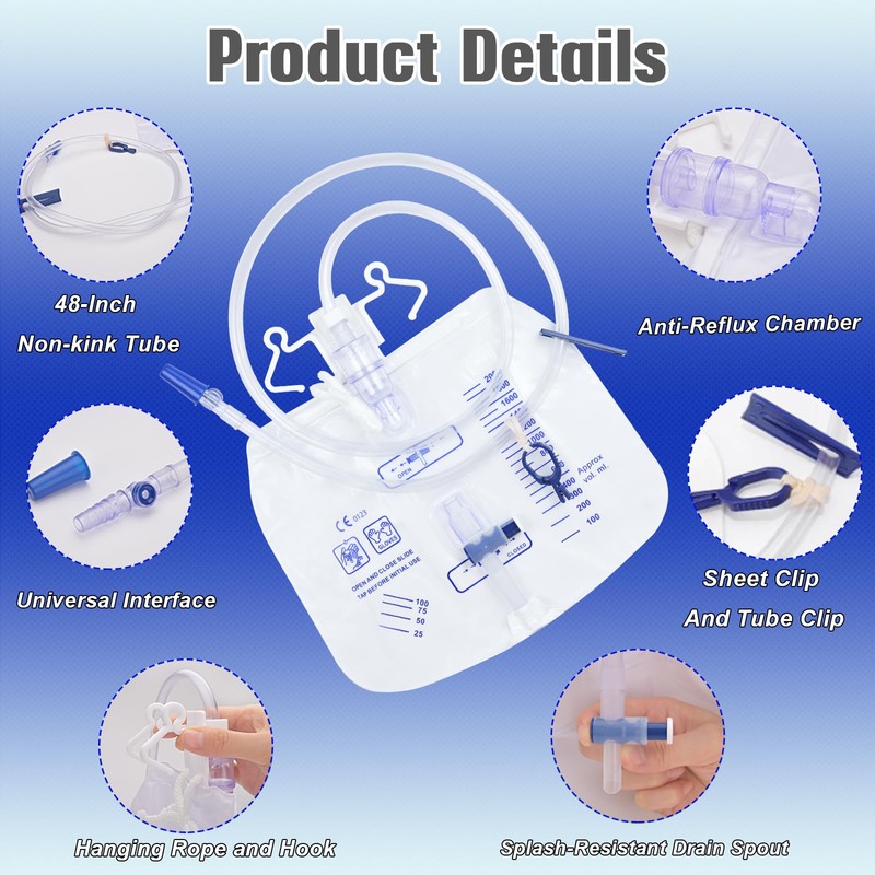 - Medical-grade MaterialEach urinary drainage bag consists of a drainage bag, 48 inch thickened, kink-resistant drainage tube, tube clip, sheet clips, hook, rope, and conical joint. Crafted from odor-blocking medical-grade material, durable, odor-resistant, and leak-proof for 24/7 protection
