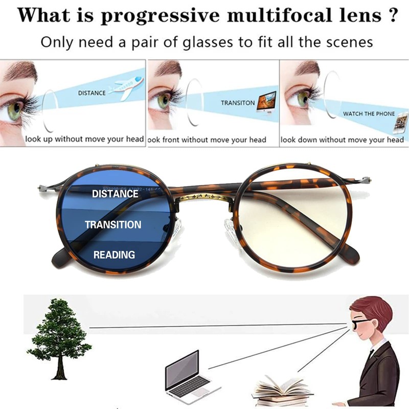 - Progressive multifocus glasses for all your need. Top part is half-power magnification for walking, shopping. The middle part is slightly reduced power magnification for working on computer, watching TV, etc. The bottom part of the lens is full-power magnification, then used for nearly distance reading. It means that you can wear the glasses anytime and anywhere