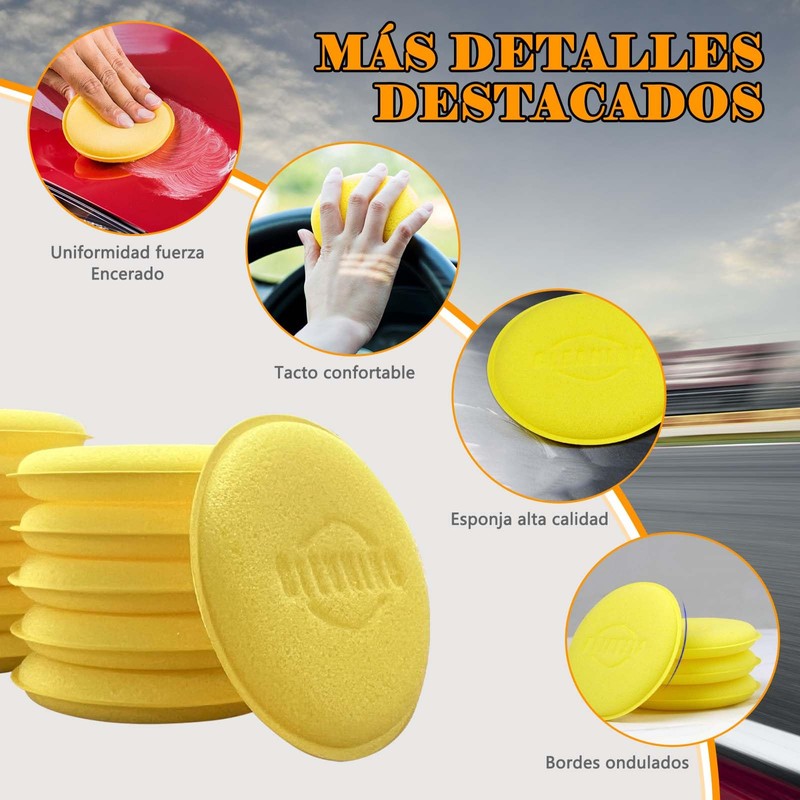 - 【Tecnología Avanzada】Esponja de pulido de coches proceso de fabricación avanzada, suave y fina mano de obra, la superficie de la esponja redonda, para asegurarse de que no hace daño a la superficie del coche, y al mismo tiempo puede garantizar que el encerado uniforme, de modo que todo el coche un nuevo aspecto, el tamaño de 10,5 x 1,8 cm, una mano puede ser recogido, fácil de usar, alrededor del borde de corte para asegurarse de que los lugares más pequeños también se pueden limpiar.