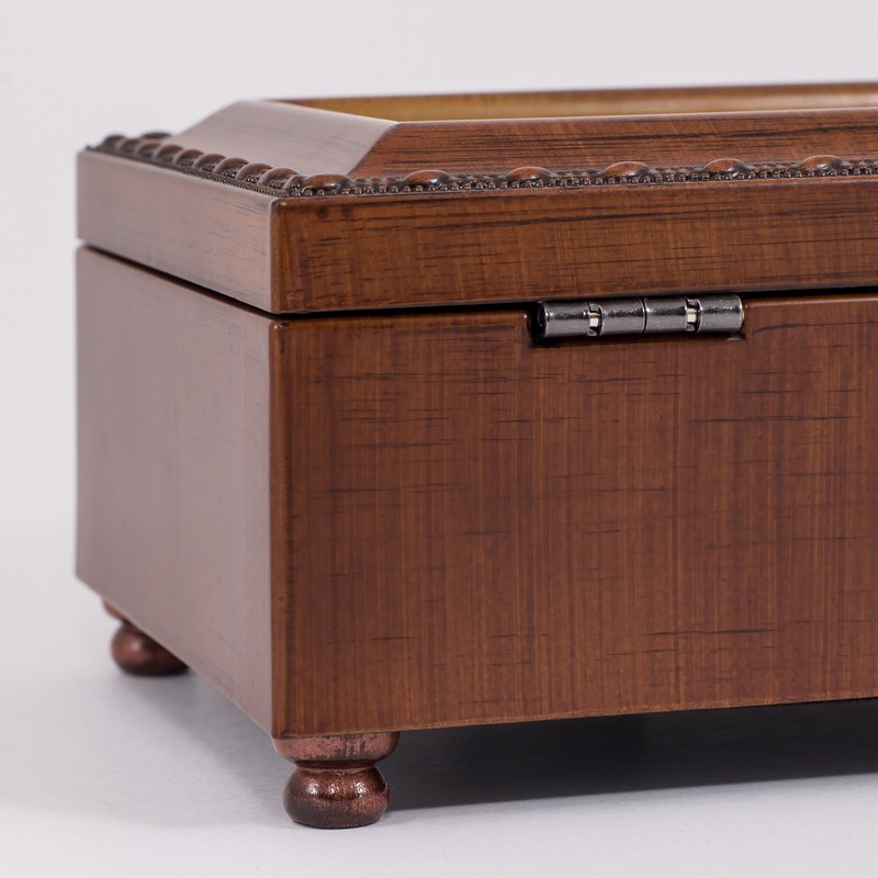 - Black velvet lined interior cushions your precious treasures; Decorative bun feet are padded to protect table top and shelf surfaces.