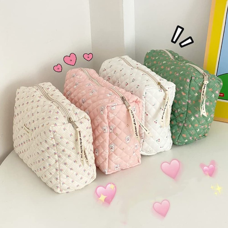 Cotton Makeup Bag Large Travel Cosmetic Bag Quilted Cosmetic Pouch Coquette Aesthetic Floral Toiletry Bag, B-Beige, 9.4x6.7x3.54in