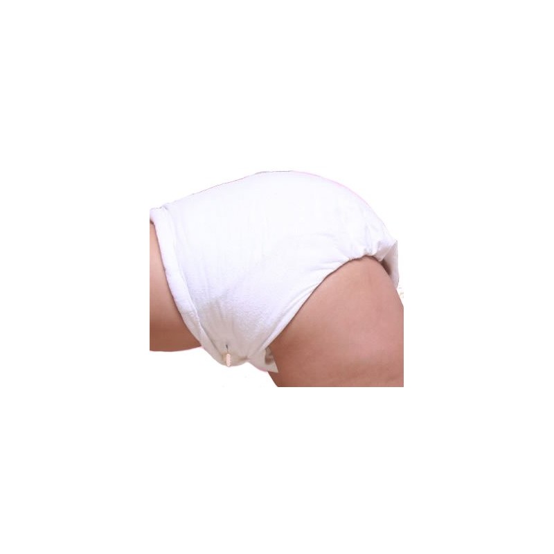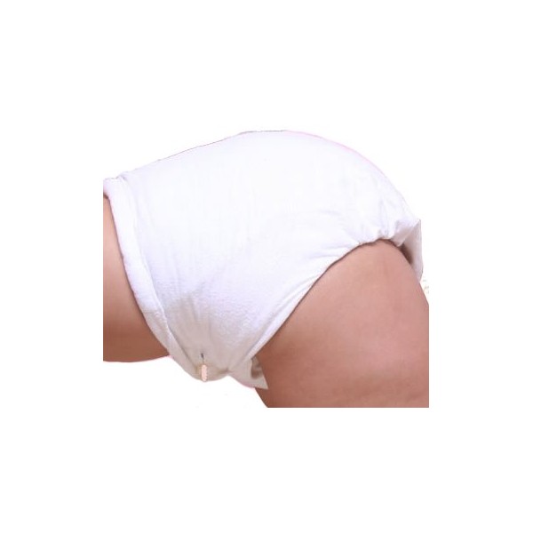 Twill weave cotton cloth prefold diaper in heavy, night time weight, 4 x 8 x 4 ply. High quality cotton Twill fabric is soft and absorbent. The "wet zone" in the center third of diaper is 8 layers of 100% Twill weave cotton. Many (most) competing diapers use a cheaper terry, foam or flannel filler covered by the Twill. This causes drying problems, provides a haven for bacteria and is difficult to pin through. Baby Pants are long lasting, high quality diapers. We recommend that parents double diaper the baby during the night and use a single diaper during the day even though these are night weight. These diapers will shrink after washing. They will shrink approximately 10 percent in both directions. One washing isn't sufficient to fully shrink them. They will also fluff up and grow softer with each washing. An extra large after a dozen wash and dry cycles will measure approximately 37" L x 32" W. The material grows thicker as it shrinks. When you measure the waist for diapers, it should be at the navel. If in doubt get the larger size. These diapers are easily folded to make a larger size fit but they can't stretch should you buy too small. Diaper your baby with the top edge of the diaper at the level of the navel. If the diaper is too long then fold them over in front for boys and in back for girls. Some parents aren't as comfortable with this thinking it's too high. Observe babies in cloth diapers. Experienced mothers know this is how to prevent leaks. Where diapers are concerned more diaper equals more absorbency equals no leaks or wet pants.