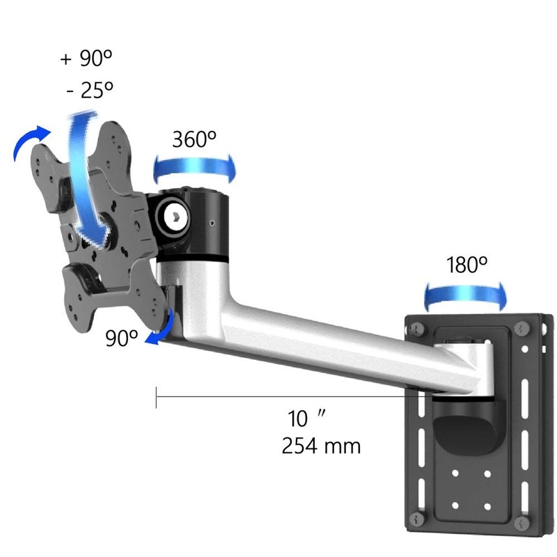 - Weight Capacity: Supports up to 44lbs (20kgs) / Tilt: +90° / -25° (provided there is no obstacles) / Swivel: Max 360° / Mounting Pattern: VESA compliant: 75x75 and 100x100, with option choice of 200x200 / Rotation: 90° (portrait or landscape) / Extension: 3" - 9.25" (77.5mm - 235mm)
