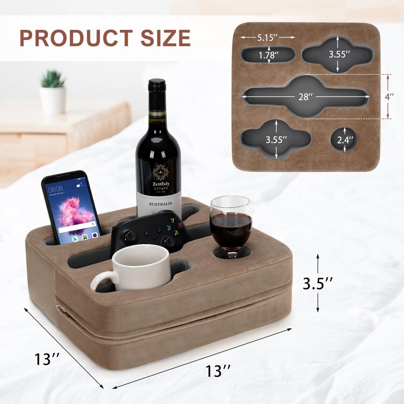 - [Keep Stability] Zettfuly's couch drink caddy with non-slip bottom, it can be securely placed on sofas, beds, and cars. It has built-in sturdy plastic blocks, intended to prevent tilting and keep your wine and beer stable