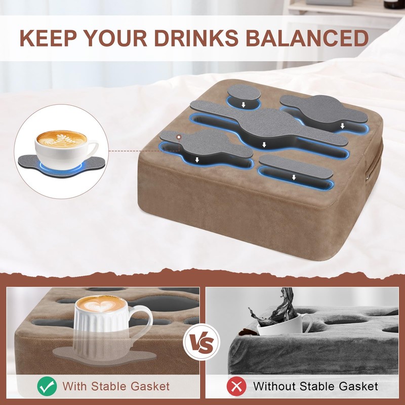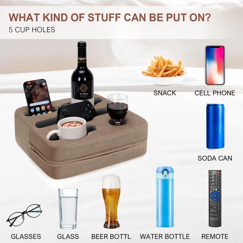 - [keep tidy] Our couch cup holder tray features 5 HOLES that can accommodate various types of cups, mugs, glasses, and beverages. Additionally, it serves as a cup holder for couch where you can place snacks, trinkets, glasses, remote controls, phones, drinks, and more on the cup pillow. Saving space and keeping things tidy. Making it an excellent accessory for sofas, couches, or beds