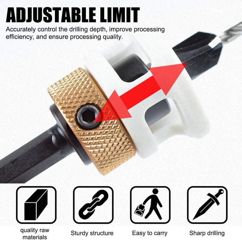 - The spiral edge of the countersink quickly removes chips from the outside of the hole, effectively preventing the accumulation of residue, preventing clogging. And with a depth limiting ring, it will not penetrate and improve work efficiency, adjustable countersink length to adjust the drilling length for different screw lengths.