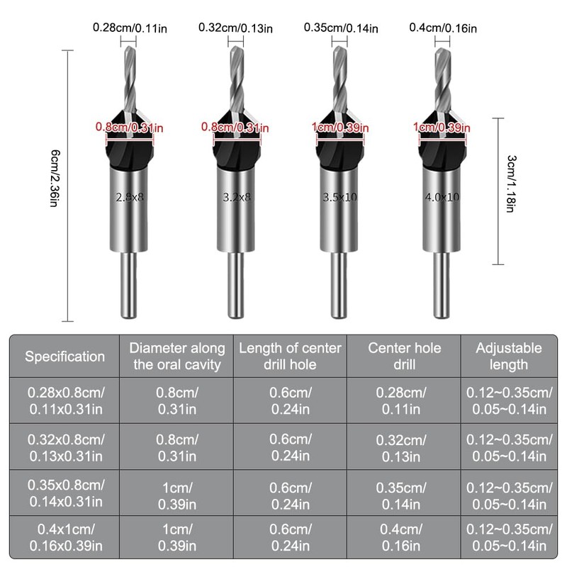 - Package includes: the 6-piece set of countersink includes 4 different sizes: 2.8 x 8 mm, 3.2 x 8 mm, 3.5 x 10 mm, 4 x 10 mm, and comes with standard 1/4 inch hex shanks and Allen keys, which allow you to easily adjust the depth of the countersink metal, making your woodworking more efficient and accurate he