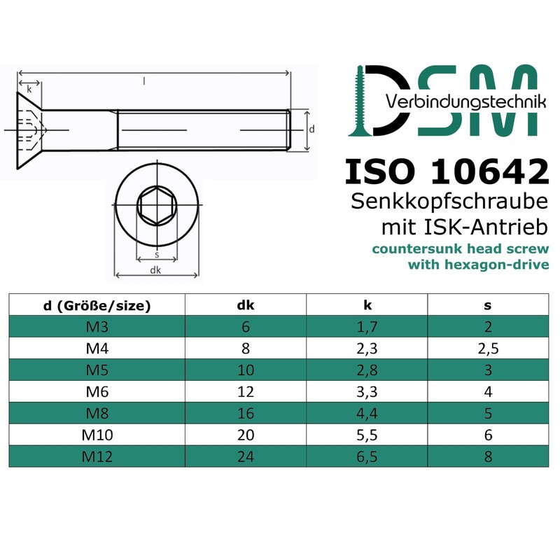 • Countersunk screw with hexagon socket (ISK) according to standard: DIN 7991 / ISO 10642