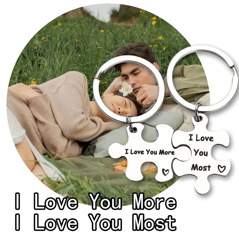 - Romantic Wife Husband Anniversary Gifts for Couples: The couple keychains set is couple Valentines Day gift for wife husband, engraved with" I love you more, I love you most", the puzzle keychains sets, one for you and one for him, fun puzzles are complete when pieced together, a special and interesting way to express your love, great bf gf valentines day gift for boyfriend girlfriend, his and hers gifts for husband wife, happy birthday gifts for girlfriend boyfriend