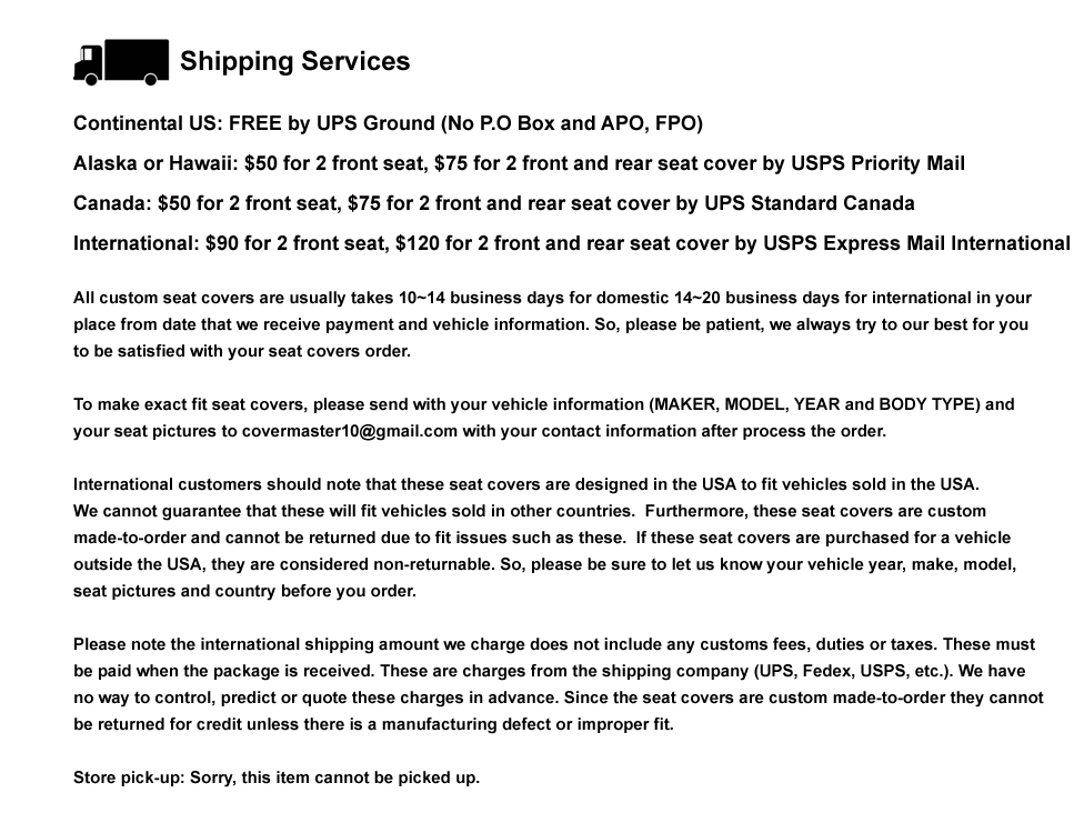 Extended Delivery (Ships from Overseas Warehouse) | 10–15 business days | $14.50 for the first item, $4.00 each additional |