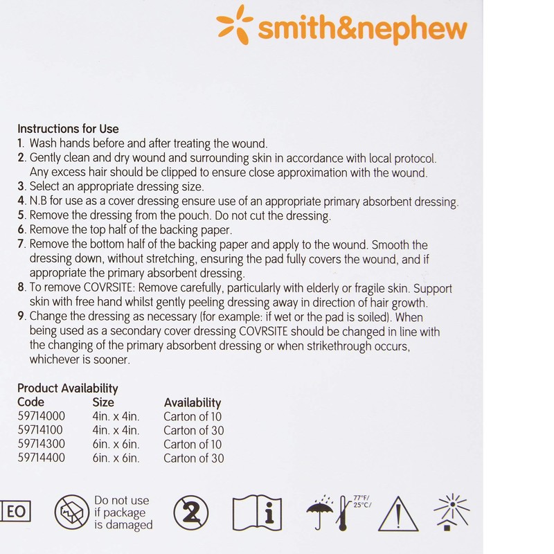 Covrsite Composite Dressing 4 X Inch NonSterile, 59714000 - CASE OF 100. Brand: Covrsite. Manufacturer Name: Smith & Nephew. Manufacturer Number: 59714000. Application: Composite Dressing. Color: White. Dimensions: 4 X 4 Inch. Shape: Square. Sterility: NonSterile. SOLD BY: CASE OF 100.