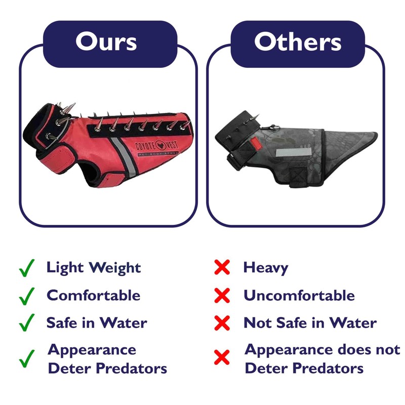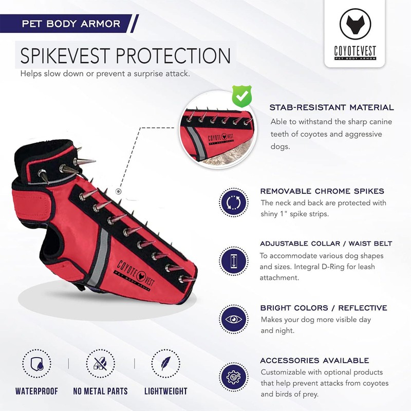 - COYOTE DOG VEST: PLEASE READ SIZING GUIDE BEFORE PURCHASING! Like a CoyoteVest, the purpose of the SpikeVest is to help slow down or prevent a surprise attack and give you enough time to react before serious injury occurs. The main difference is the SpikeVest uses two wide belts with Velcro while the CoyoteVest uses nylon straps with snap buckles.