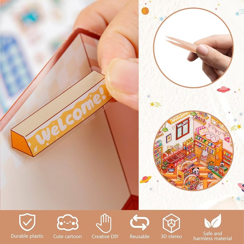 - 3D apartment sticker set: our 3D stickers include 5 themes: supermarket/flower shop/bookstore/cafe/bakery/library. You can redesign and adjust the scenes according to your preferences and style ideas.