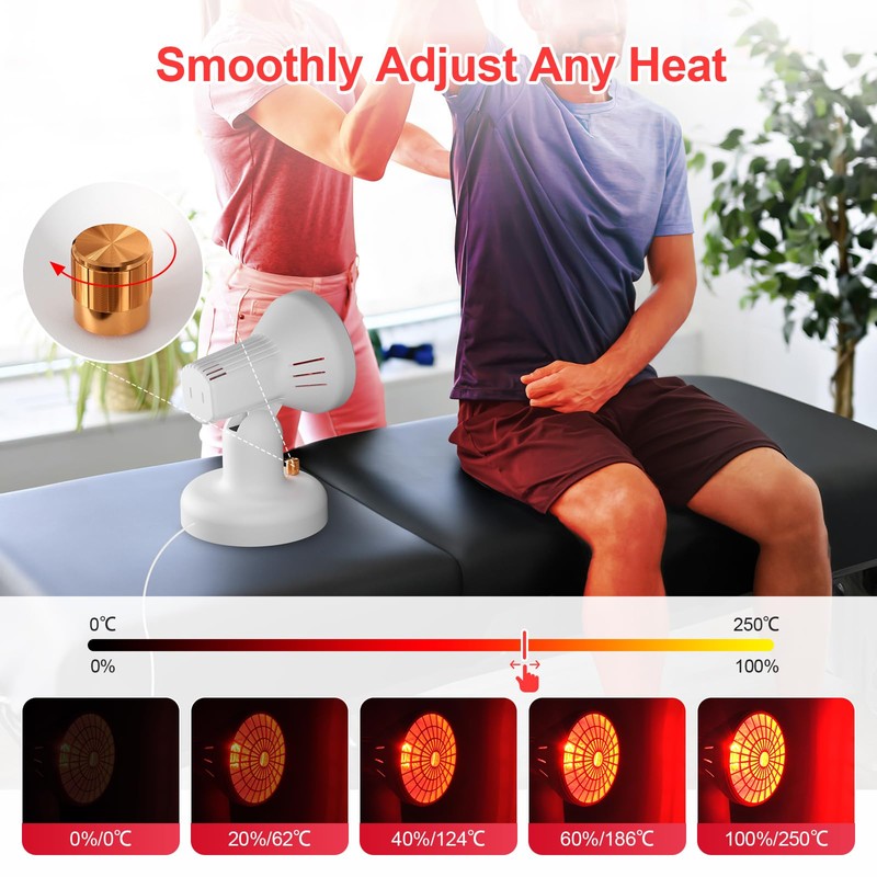 - Fully recognisable infrared lamp: by turning the button switch to adjust the brightness and temperature from 0% (0 ℃) to 100% (250 °C). Allow you to freely adjust the brightness and temperature of the light according to different needs, be it for working, yoga or relaxing, luminous, medium and soothing light to perfectly allow different usage scenarios.