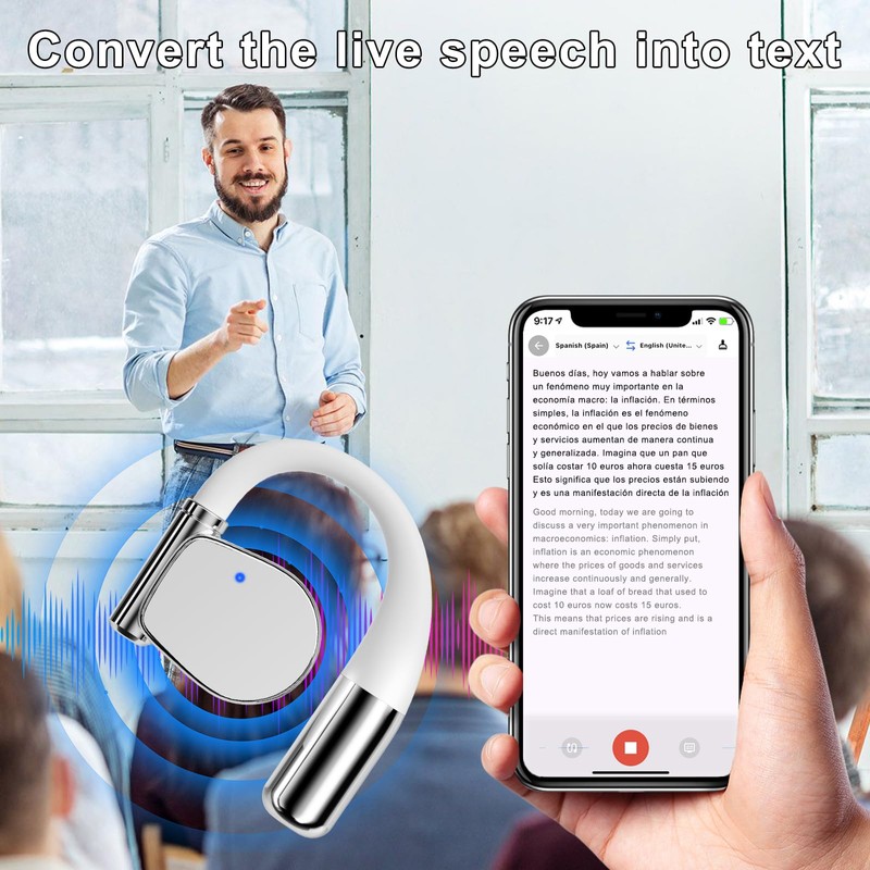 - Active Noise Cancellation: Language translator two way can achieve active noise reduction. Directional acoustic transmission, sound transmission is more concentrated, effectively reduce the leakage of sound phenomenon, care for privacy. Ergonomic ear-hanging design to ensure comfortable wearing, even for long time use without pressure.