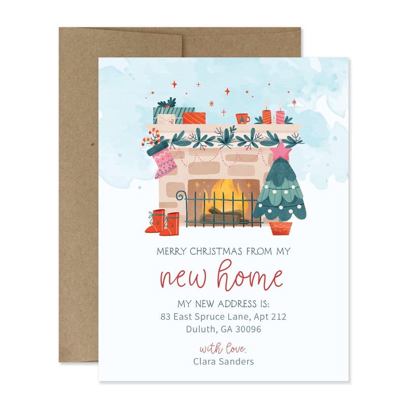 - Share your new address in a festive and memorable style with personalized, cozy Christmas holiday-themed Moving Announcement notecards with envelopes. The flat card design features an inviting fireplace Christmas scene. The back of the notecard will be blank white, leaving room for a handwritten message if desired.