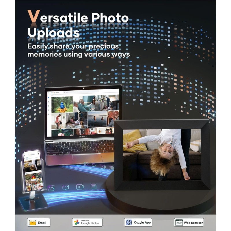 - Easy Setup & Use: Cozyla digital picture frames load from phone is designed to be user-friendly for all ages. You don't need to have social media to enjoy sharing photos with your family and friends. Just follow a few simple steps to set up your frame and use the touch screen to navigate the features. Cozyla makes photo sharing easy and fun.