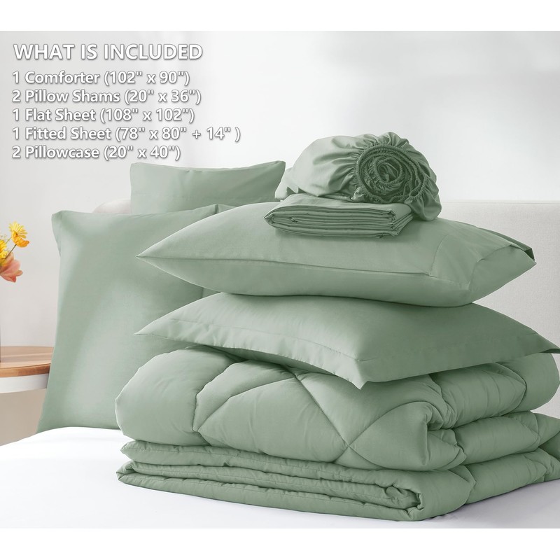 - What You Can Get: King Size bed in a bag includes 1 Comforter 102"x90", 2 Pillow Shams 20"x36", 1 Flat Sheet 108"x102" , 1 Fitted Sheet 78"x80"+14" and 2 Pillowcase 20"x40"; Our bed in a bag is packaged in a vacuum bag, so you can dry it in low heat or tap the comforter gently while baking it in the sun to fluffy again