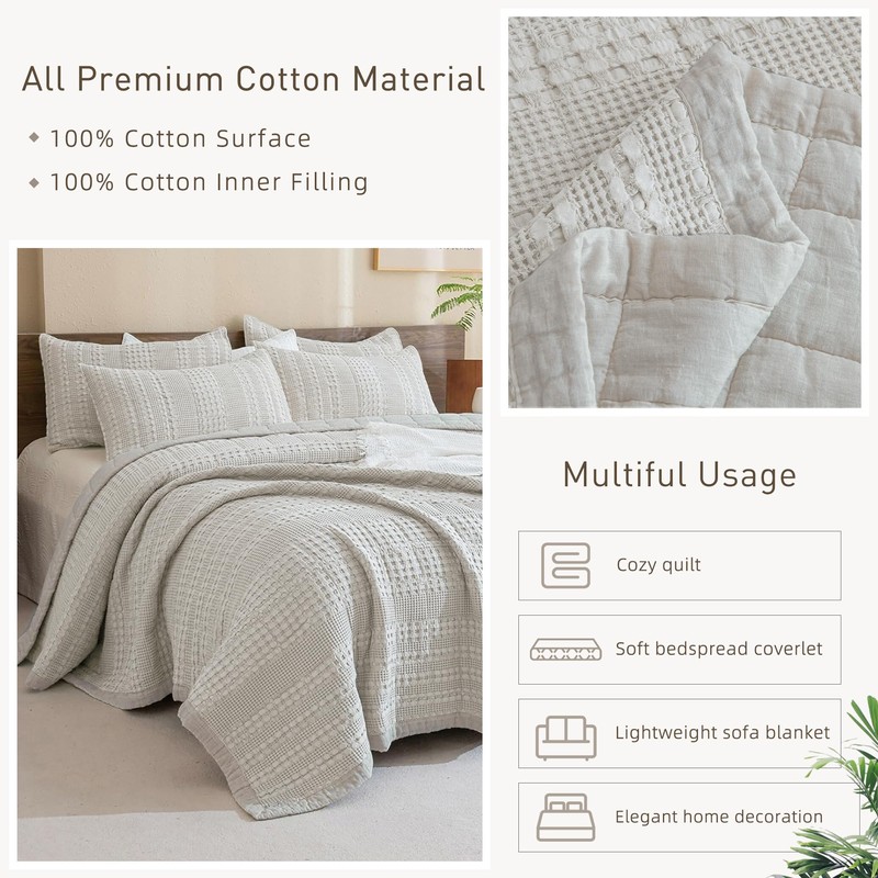 CozyTide Waffle Quilt Set King Size (110x98 Inch),100% Cotton Khaki Bedding Bedspread Coverlet Set,3Pcs All Season Soft Lightweight Bedding Set & Collections
