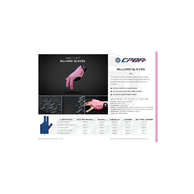 CPBA Professional Billiards Glove (Pink, X-Small, Left hand Open Finger)