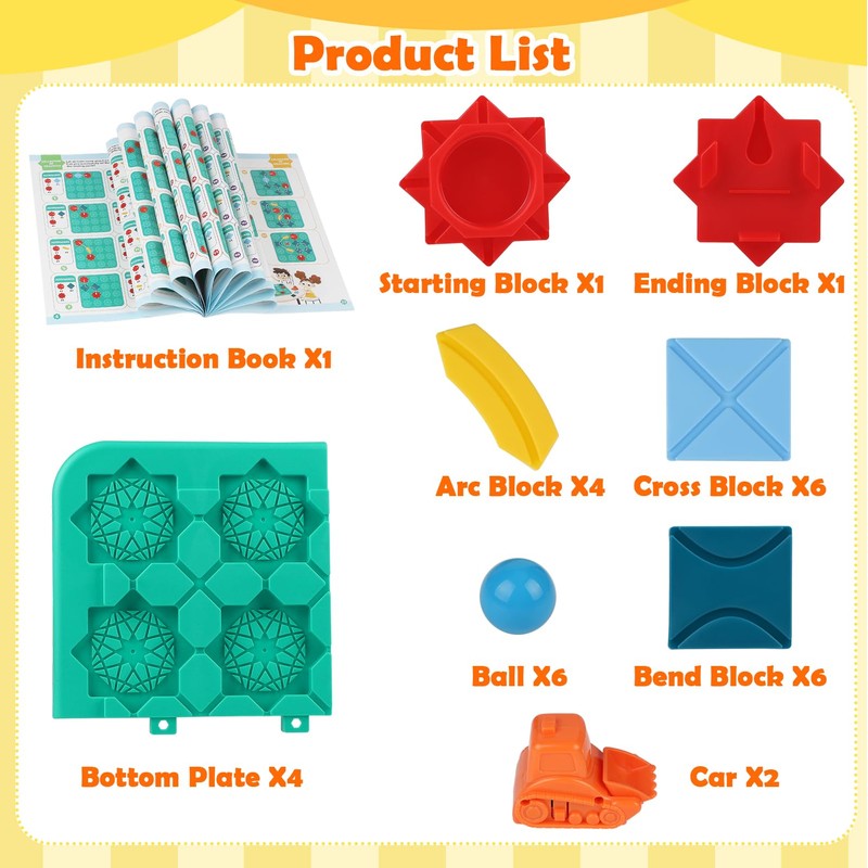 - Box contents: 118 challenges and 4 levels – colour box, removable game board x4, green bending blocks x6, blue, cross blocks x6, yellow arch blocks x4, start and end point, marble balls x3, pull back cart x2, manual (English language not guaranteed)