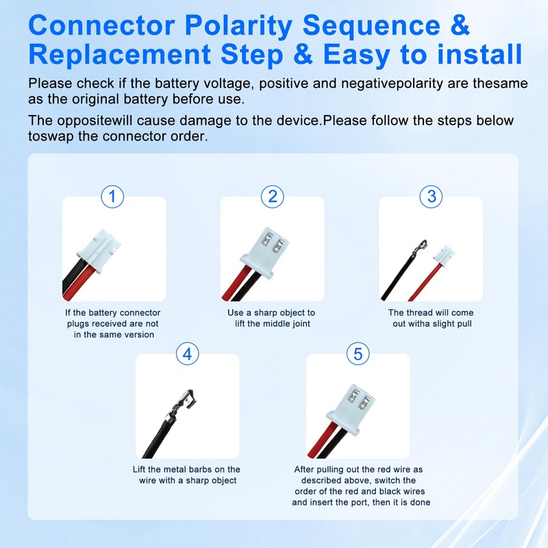 - Battery Size: 2.6 x 0.82 x 0.82 inch / 66 x 21 x 21 mm,Battery Type : Li-ion; Wattage: 9.62Wh,Type of plug: JST-PH2.0mm 2-pin female connector. The red wire is the positive pole "+", the black wire is the negative pole "-". please check carefully before purchasing !!!).