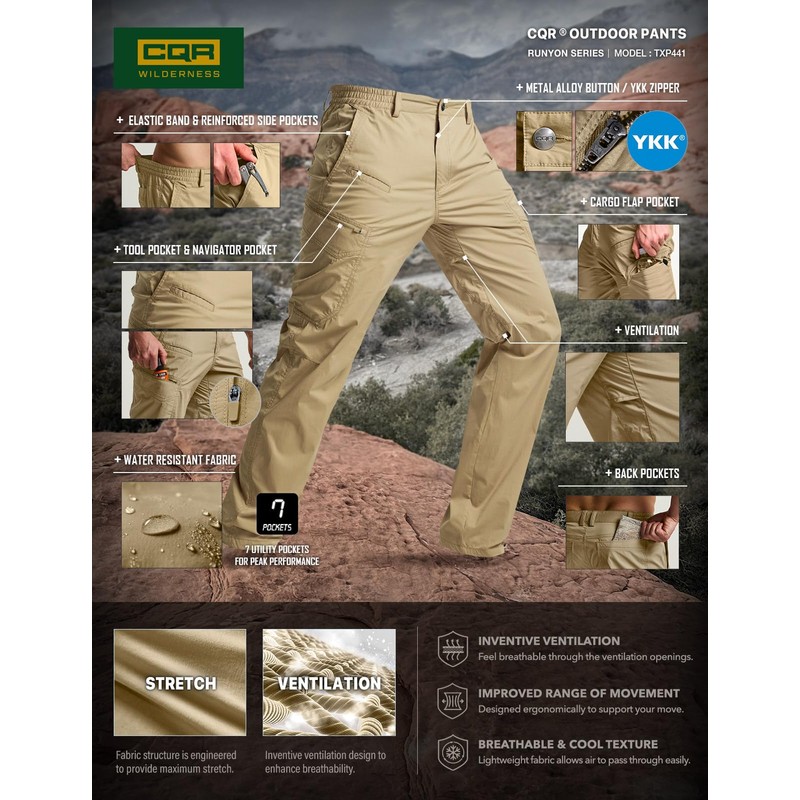 CQR Men's Quick Dry Tactical Pants, Water Resistant Outdoor Pants, Lightweight Stretch Cargo Work Hiking Pants, Runyon Cargo Pants Dune Khaki, 32W x 34L