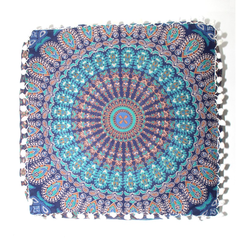 CRAFT KALA Blue Peacock Large Hippie Mandala Meditation Floor Ottoman Pillow Cushion Pouf Cover Square Poufs Bohemian Circle Floor Cushion Case Outdoor Fireplace Living Room Decor Cover 16" Square