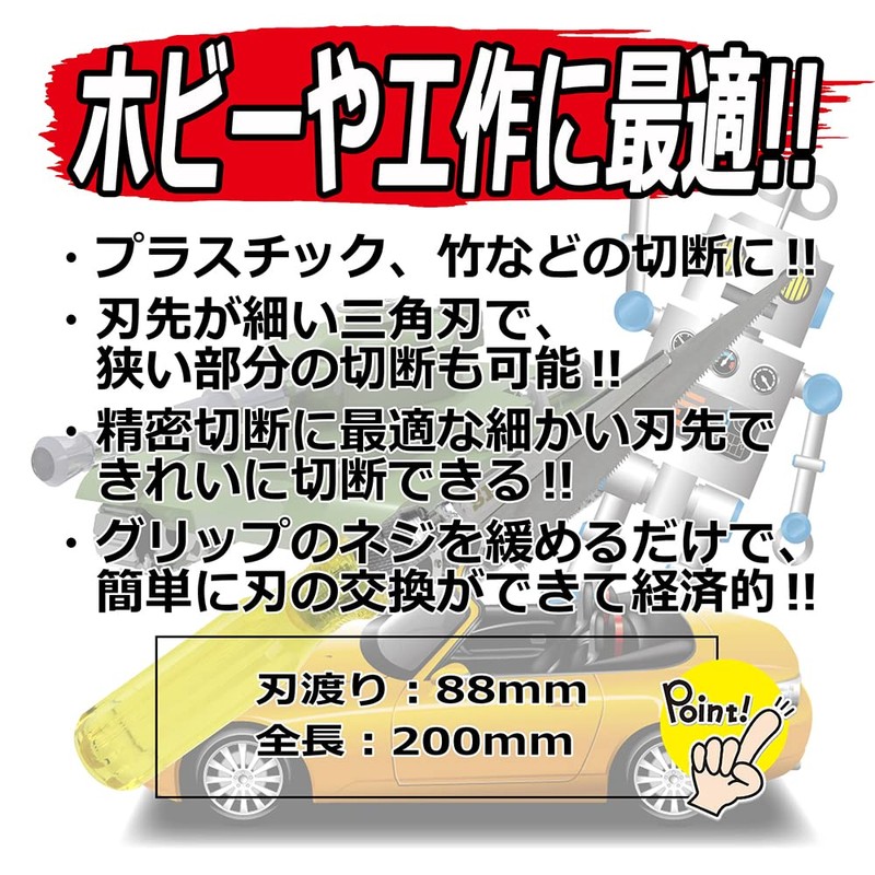 - Uses: For cutting plastic, bamboo, etc