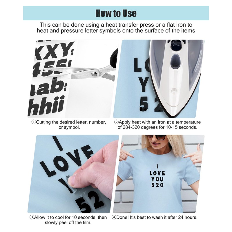 - ???????? ?????? ??????, ???????????????? ?????? ?????? ?????????? ????????????! With just a few simple steps, you can personalize your clothing or fabric items using Craftizon iron-on letters and numbers. Simply place the desired letters and numbers onto the fabric, apply heat using an iron or heat transfer tool at a temperature range of 284-320 degrees Fahrenheit for approximately 10-15 seconds. No complicated skills are required, making it accessible for everyone to showcase their creative talents.