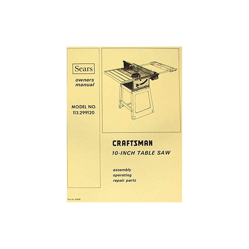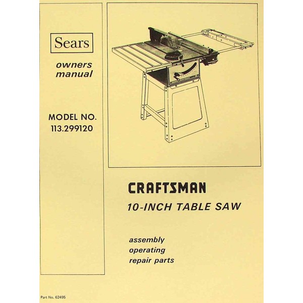 This is a reproduction, not a photocopy, of an original Craftsman 10-inch Table Saw 113.299120 Operator's and Parts Manual. This manual contains information on operating instructions, adjustments, and a complete set of exploded view diagrams of the parts. See index below.