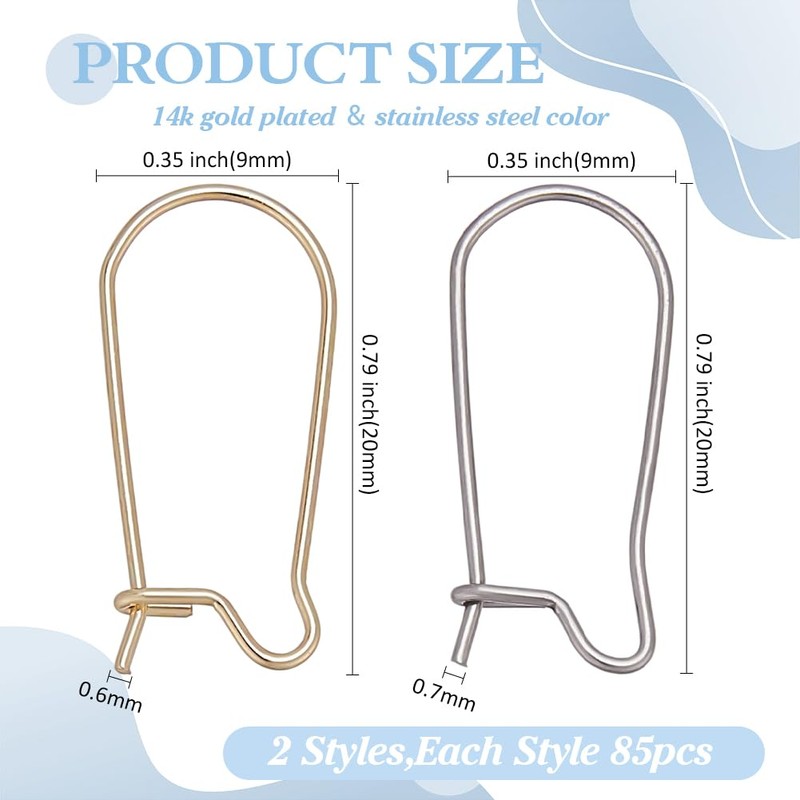 - Package Includes: You will receive 170pcs 2 styles earring hooks in gold and stainless steel, 85pcs of each color, the gold size is about 20mm long, 9mm wide, 0.7mm thick, pin: 0.7mm, the size of stainless steel is about 9mm wide, 20mm long, 2mm thick, pin: 0.6mm