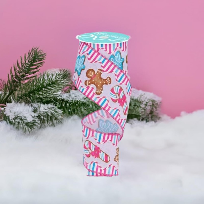 - FESTIVE DESIGN: 2.5-inch wide ribbon featuring charming gingerbread cookies, candy canes, and Christmas trees pattern in pink, blue, and brown on white background