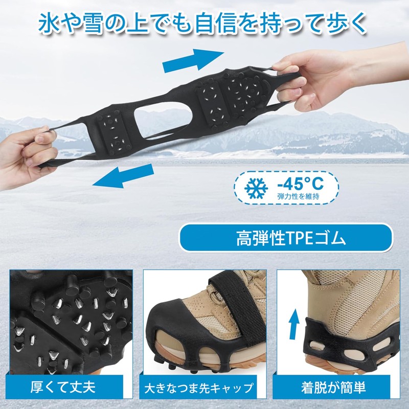 • (Durable Material) The main body of the surrounding material is made of eco-friendly rubber (thermoplastic elastomer), so it has excellent strength, and is resistant to cold temperatures of -13°F (-45°C), and it is elastic, and can be used with a variety of shoe sizes. The claws are made of stainless steel for excellent abrasion resistance and durability