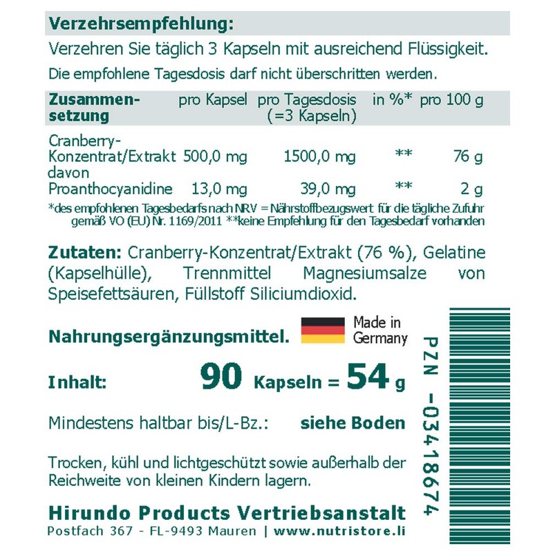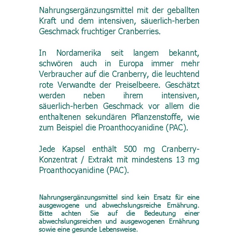 - Each capsule contains 500 mg cranberry concentrate/extract with at least 13 mg proanthocyanidine (PAC)