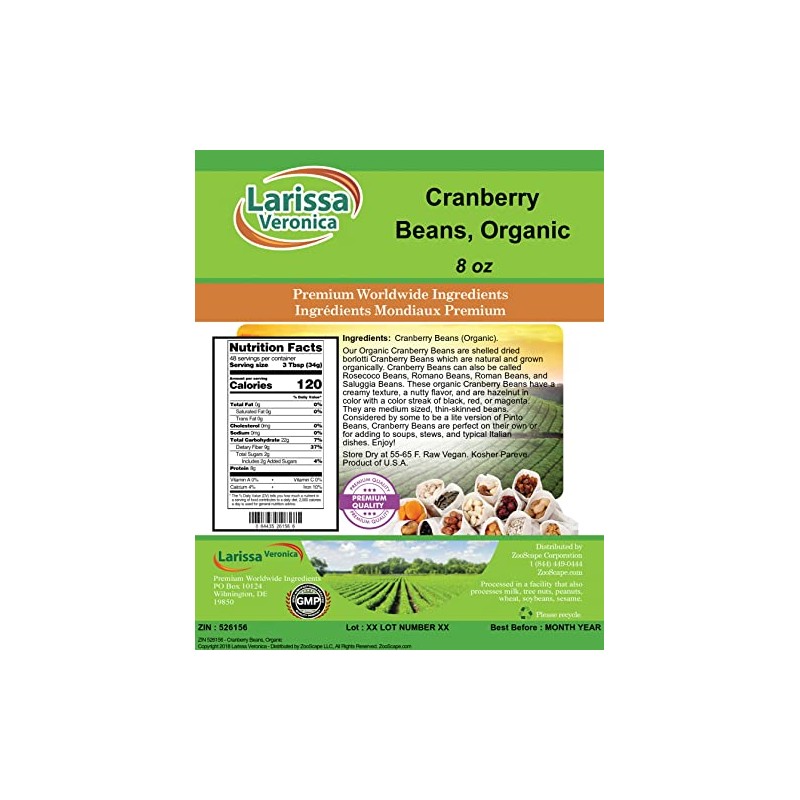 Our Organic Cranberry Beans are shelled dried borlotti Cranberry Beans which are natural and grown organically. Cranberry Beans can also be called Rosecoco Beans, Romano Beans, Roman Beans, and Saluggia Beans. These organic Cranberry Beans have a creamy texture, a nutty flavor, and are hazelnut in color with a color streak of black, red, or magenta. They are medium sized, thin-skinned beans. Considered by some to be a lite version of Pinto Beans, Cranberry Beans are perfect on their own or for adding to soups, stews, and typical Italian dishes. Enjoy! - Larissa Veronica is an exclusive line of natural premium-quality products that use only the purest and finest ingredients from around the world. Larissa Veronica is hallmarked by the highest possible standards of purity, stability and freshness. All of our products are prepared with the highest elements of quality control, from raw materials through the entire manufacturing process, up to and including the moment that the bottles or bags are sealed for freshness and shipped out to you. Our highest possible standards are certified by independent laboratories and backed by our personal guarantee. - Larissa Veronica strives to make all products affordable and we are constantly researching the market to maintain our affordability and to look for new ways to serve you and the ones you love. Larissa Veronica has become a trusted household name for many families. - Larissa Veronica is packed in tamper-proof, food-grade, recyclable containers. - ZooScape is proud to be the exclusive distributor of all Larissa Veronica spices, snacks, foods and ingredients in the United States, Canada and around the world. - Store Dry at 55-65 F. Raw Vegan. Kosher Pareve. Product of U.S.A.