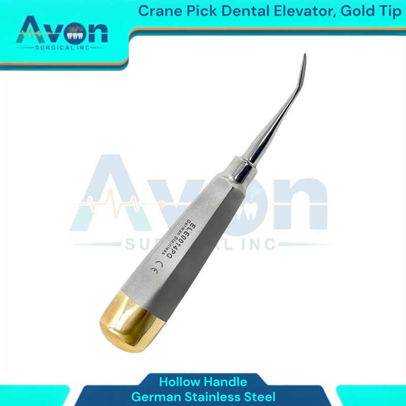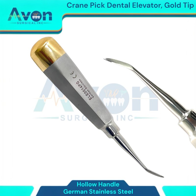 - Includes: 1 Each - Crane Pick Dental Elevator, Slight Bent Tip, Gold End Hollow Handle - German Stainless Steel.