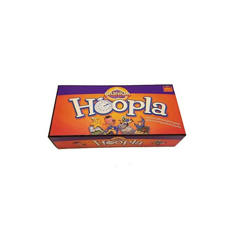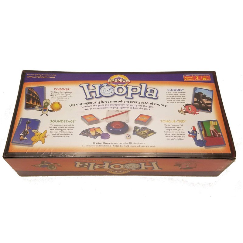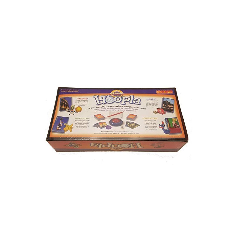 What's all the hoopla about? Cranium Hoopla—a cross between party game and card game where every second counts! The goal is to play all cards before the 15-min. timer expires. Each card has an image and players are told whether it is a "who, what or where" topic. Questions include Cloodles (drawing), Soundstages (wordless acting with gestures and sounds), Tongue-Tieds (words beginning with 1 letter of the alphabet) and Tweeners ("It's bigger than this but smaller than that."). Comes with 285 Hoopla cards, timer, 10-sided die, and pad and pencil. For 2 or more players. Made in USA.