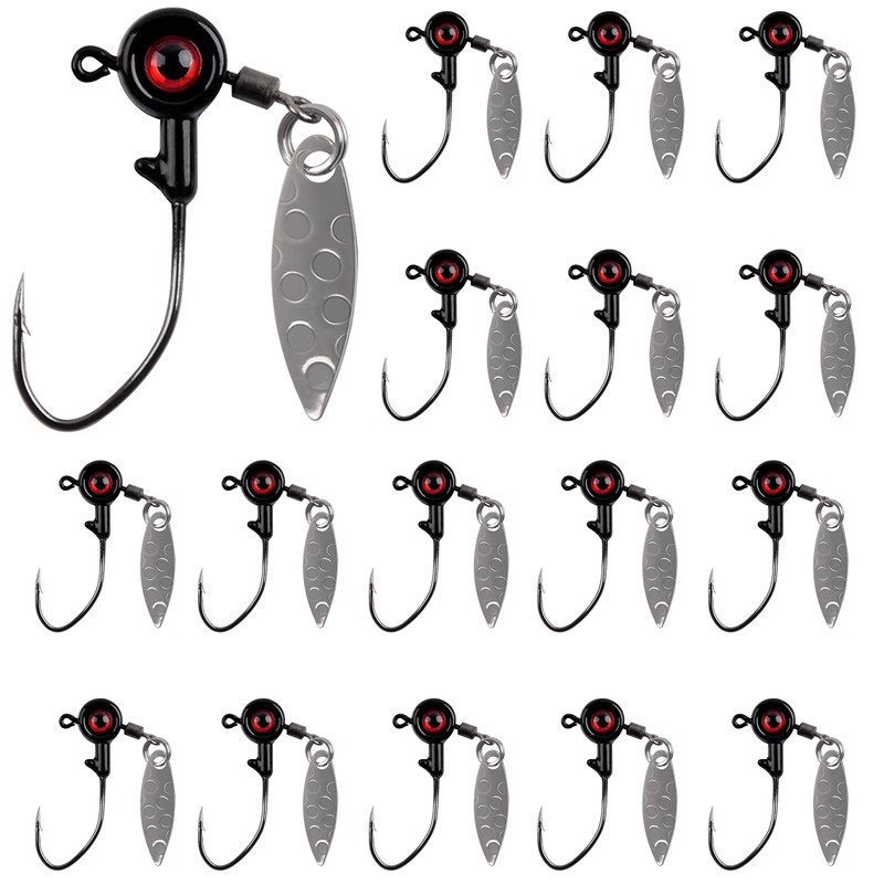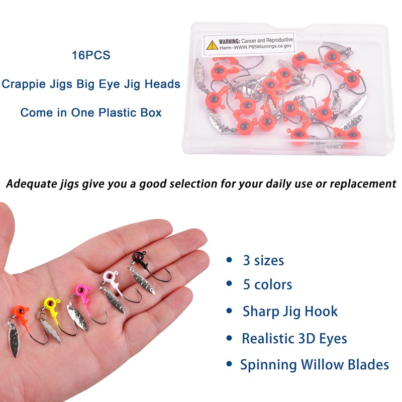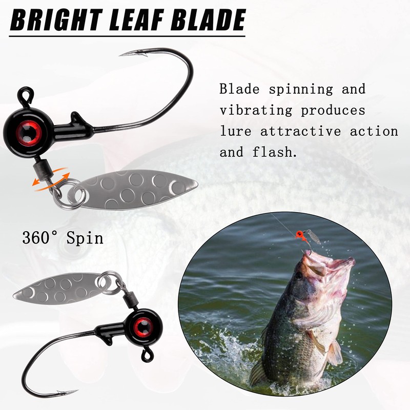 - UNIQUE: Fishing jig heads is equipped with big bright realistic 3D eyes, spinning willow blades, flexible rotation split rings to help you catch fish effectively.