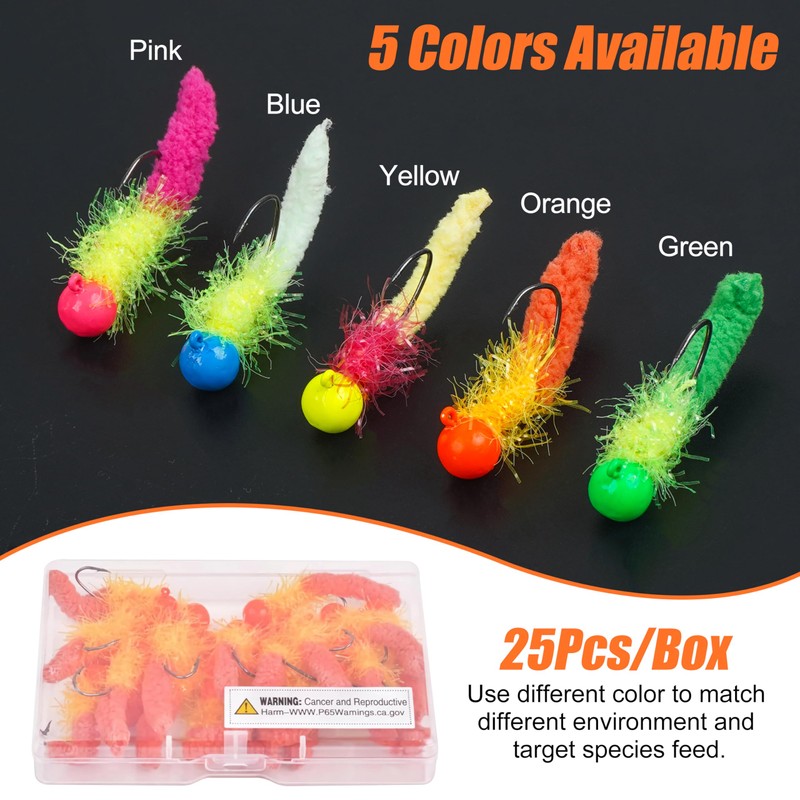 - 【Package】1/8oz-3.5g, 25pcs/box, 5 different colors available, in a plastic box for easy access and storage. The crappie jig heads will make your fishing adventure more enjoyable.