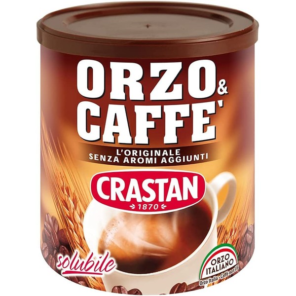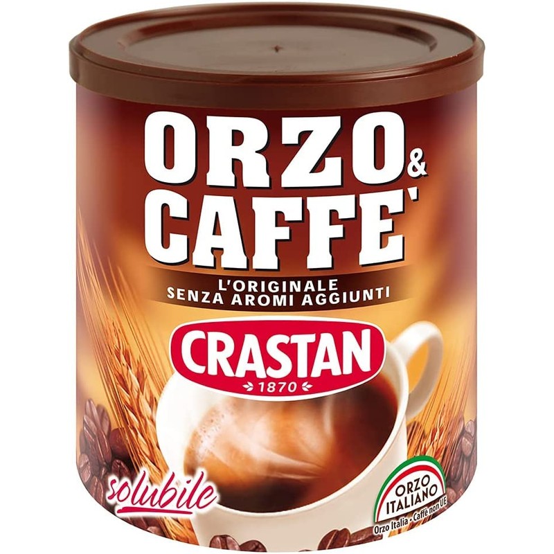 - Crastan Orzo & Caffe Instant "Solubile" Barley & Coffee Traditionally, many Italian families mix ground coffee and barley to obtain a breakfast drink for the whole family, ideal for those who have to limit the amount of caffeine they consume. Crastan "Orzo & Caffè" (barley & coffee) was first produced in 1992 and is the modern-day version of this ancient tradition. MORE GRAINS, LESS COFFEE "Orzo & Caffè" (barley & coffee) is a soluble product based on roasted cereal-grains, chicory and coffee. Combining natural, flavorful grains and rich coffee aromas, we've created a beverage that allows you to minimize your caffeine consumption without having to give up the pleasure of a cup of coffee. With "Orzo & Caffè" you can feel free to enjoy a cup more often during the day, because it contains less caffeine compared to a pure soluble coffee. The gentle flavor of barley, the natural sweetness of malt and chicory, and the unique blend of select coffee varieties give "Orzo & Caffè" a rich, satisfying flavor all its own. A touch of cocoa, finally, to complete this drink, for your relaxing moments. Ingredients: Instant barley and barley malt (49%), instant coffee (33%), instant chicory, instant rye, cocoa powder. Net Weight: Cardboard can 120g