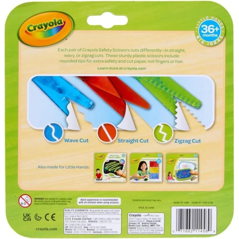 Safe paper cutting for preschoolers with 3 different cutting edges (straight, wavy, zigzag). The My First Crayola Safety Scissors are specifically designed for little hands with rounded tips and plastic blades to safely cut paper only—not hair or skin. Includes 3 plastic safety scissors with 3 different cutting edges.