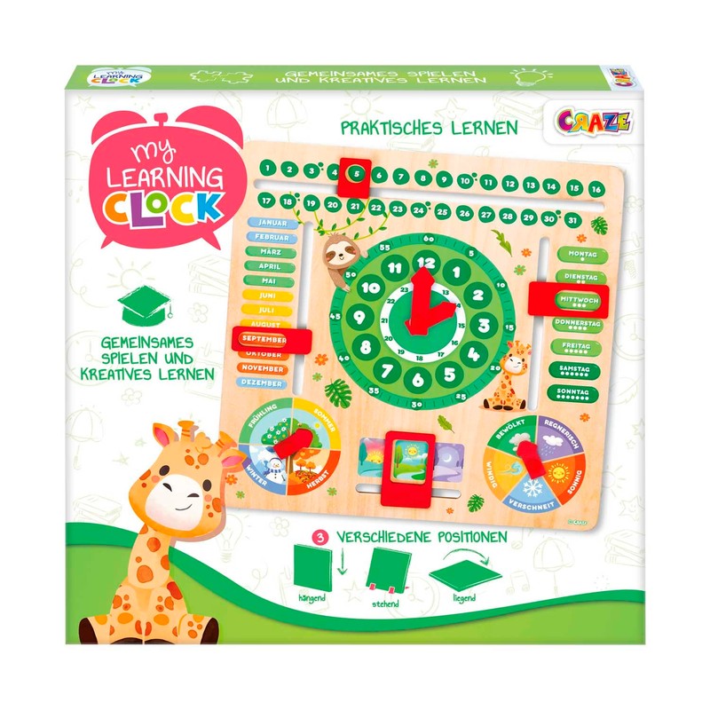 - Teaching Clock (Hours, Days, Seasons, Months, Numbers) Made of wood with removable stand. Subject of sweet animals - German language