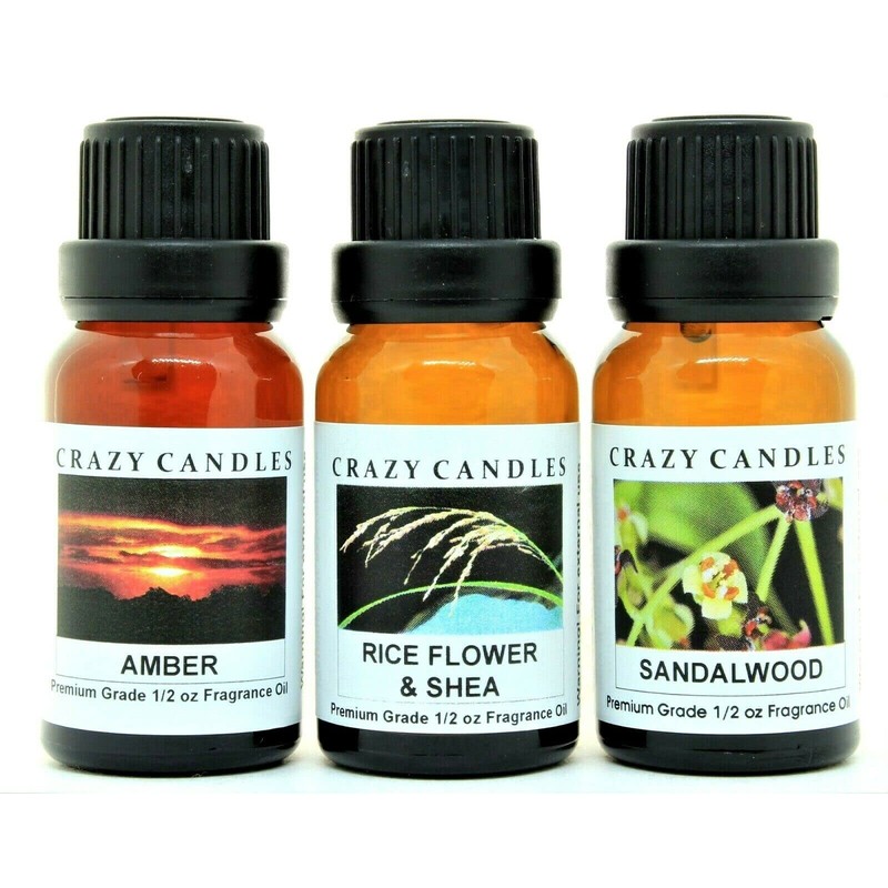 Crazy Candles 3 Bottle Set: 1 Amber, 1 Rice Flower & Shea, 1 Sandalwood 1/2 Fl Oz Each (15ml) Premium Grade Scented Fragrance Oil