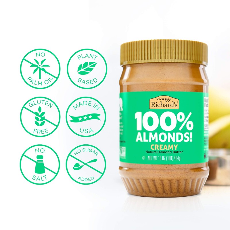 - Supports Your Healthy Diet – Just like Crazy Richards Peanut Butter, this almond butter has zero cholesterol. Unsweetened and unsalted, it has no palm oil or hydrogenated oil.